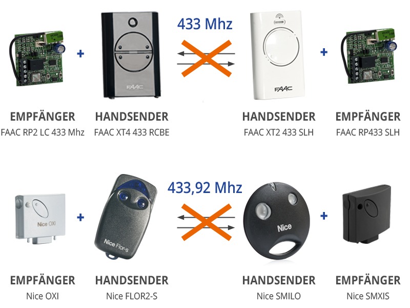 Die Fernbedienungen arbeiten auch auf verschiedenen Frequenzen. Die am meistens benutzte Frequenz ist 433 MHz, aber viele Hersteller bieten auch Zubehör mit 868 MHz. Die Freguenz 868 Mhz ist am besten für das Stellen geeignet, wo große Funk-Störungen auftreten. Wichtig ist zu beachten, dass das Zubehör von demselben Hersteller nicht immer miteinander kompatibel ist. Die Fernbedienung und der Empfänger müssen diegleiche Frequenz haben und von dergleichen Serie sein (zum Beispiel : NICE SMILO und das NICE Flor verwenden beide Frequenz 433 MHz, sie arbeiten aber auf verschiedenen Radiowellen, daher sind sie mieinander nicht kompatibel).