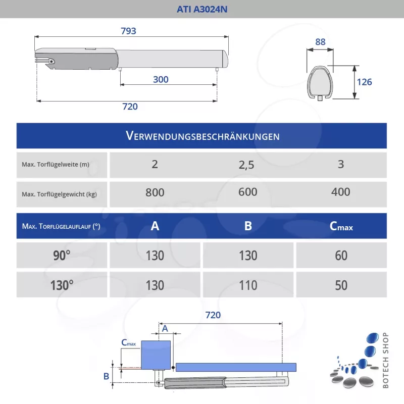 Der Flügeltorantrieb A3024N ist sowohl für Einfamilienhäuser als auch für größere Wohnanlagen bestens geeignet. Seine Vielseitigkeit und einfache Anpassbarkeit machen ihn zur idealen Lösung für unterschiedlichste Anforderungen. Ein Montageschema mit relevanten Abmessungen finden Sie hier: SCHEMA