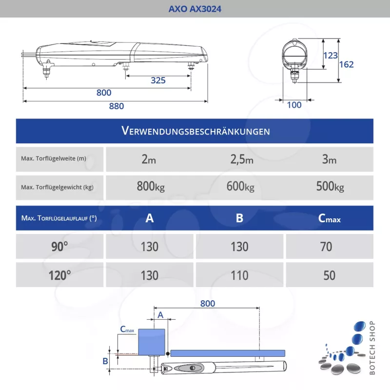 Elektrischer Toröffner für Flügeltor CAME AXO AX3024 eignet sich für max. 3 m Flügellänge bei max. 500 kg Flügelgewicht. Der elektr Torantrieb CAME AXO 3024 kann auch bei kleineren Abmessungen montiert werden (siehe Schema).